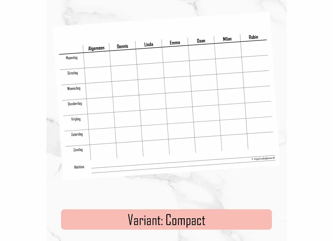 Toch liever niet steeds zelf printen, bekijk dan onze planners op papier in de shop. Hier vind je een gepersonaliseerde familieplanner zonder datum. Net zoals de printable met gepersonaliseerde kolommen en de weekdagen, maar dan 52 pagina’s van stevig papier en ingebonden met een zwarte wire-o spiraalbinding.
